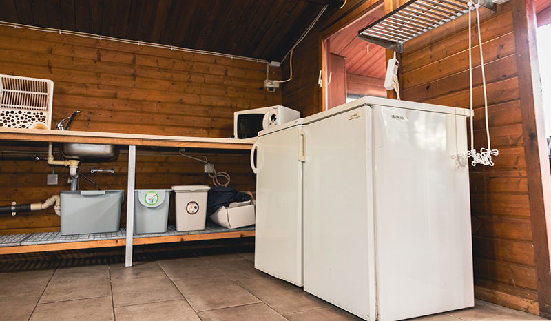 Es bietet Koch-, Kühl-, Abwasch- & überdachte Sitzmöglichkeiten sowie einen Grillplatz.